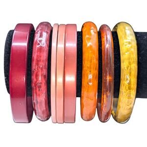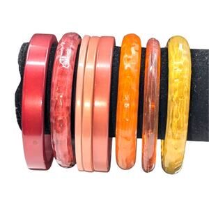 Stack of Eight Fall Colors Bangle Bracelets. Three have a similar texture, weight and 'hammered' look. The others coordinate nicely. Pre-owned, these bracelets are in excellent condition.