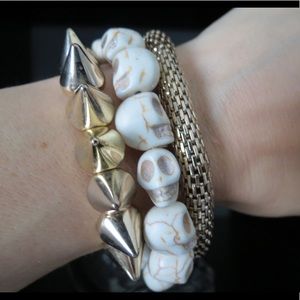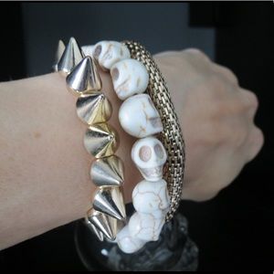 Set of 3 bracelets- one is gold toned mesh, one with gold spiked beads and the third has skull beads in a natural bone color. All three stretch to fit over the hand. Cool statement piece to add flare to your outfit!