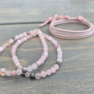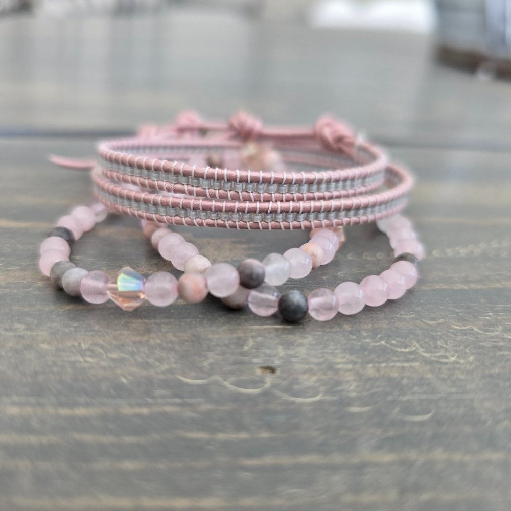 Set of 2 elastic bracelets and a double wrap seed bead/leather bracelet. Handmade items
