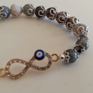 Stackable evil eye stretch bracelet with large infinity symbol charm Handcrafted with handpainted glass beads, labradorite, and picasso jasper beads. This bracelet includes iron and alloy metals. Measures the standard 6.5 inches for women's bracelets.