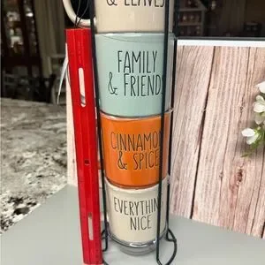 Set of four stackable mugs with stand. Features cream, green, orange, and tan colors all with fall and family sayings!! Perfect for family and friends gatherings.