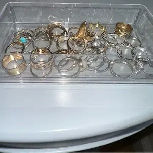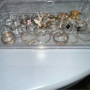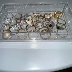 A collection of Stackable Fashion Rings. 30+ rings. Silver and gold tone. Some sparkly ones. A couple of toe rings. Various sizes. Some adjustable size. Super fun!