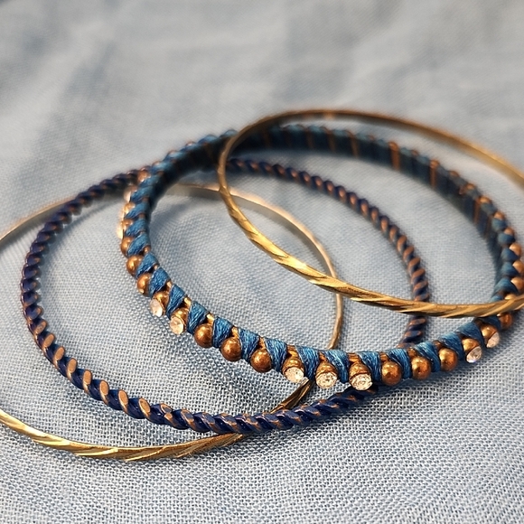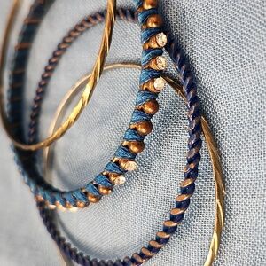Stackable Gold & Blue Thread-Wrapped Bangle Set