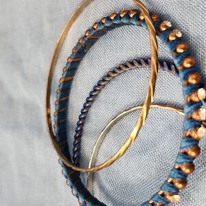 Get this gorgeous set of four stackable bangles for just $15! This bundle includes two plain gold-tone bangles and two unique thread-wrapped bangles, perfect for adding a bohemian touch to any outfit.