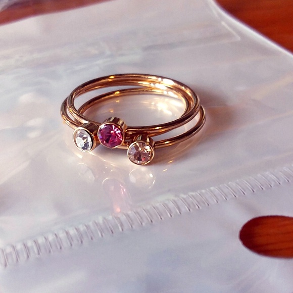 A set of three stackable delicate gold rings. 1 Pink Stone, 1 Clear Stone, and the third is an orange-ish peach color. Size 7.