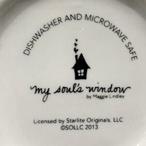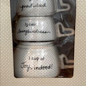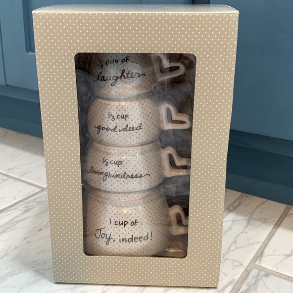 NIB stackable measuring cups. Each cup has its measurement with a saying such as “1/3 cup good deed”. Cups are a light cream color with blue dots and a small red heart in the inside and heart shaped handle. Dishwasher and microwave safe.