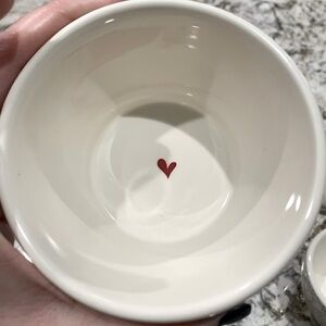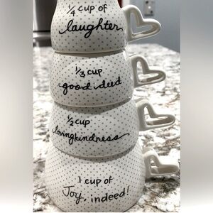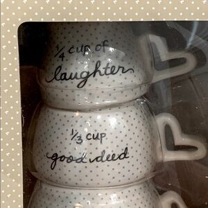 NIB stackable measuring cups. Each cup has its measurement with a saying such as “1/3 cup good deed”. Cups are a light cream color with blue dots and a small red heart in the inside and heart shaped handle. Dishwasher and microwave safe. Slight damage on interior plastic packaging only in transit. I have secured interior packaging to ensure safety in transit.
