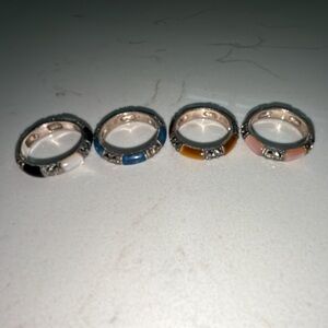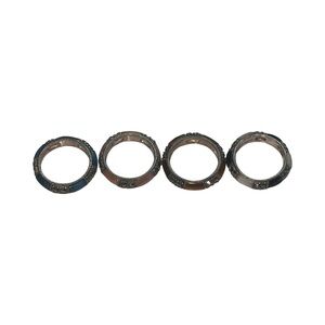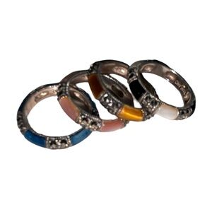 Lot of 4 stackable women's rings featuring black onyx, mother of pearl, tiger’s eye, chalcedony and marcasites. Cool pieces designed for layered looks. These are old stock but unused, but they have tarnishing. They all size 5. Markings: A925, THAILAND. They will be shipped as shown. Thanks for looking.