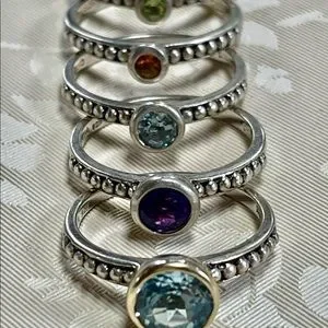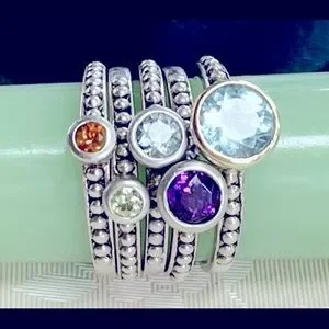 Purchased this beautiful stack rings many years ago. I’ve used it a couple of times and kept it in stored since then. It’s beautiful! The stones are very sparkly. Perfect for daytime or evening.