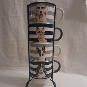 SUPER CUTE! 4 different dog breeds in space-saving metal rack. 15 oz, Microwave and dishwasher safe, no chips or cracks. New!