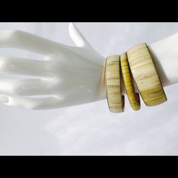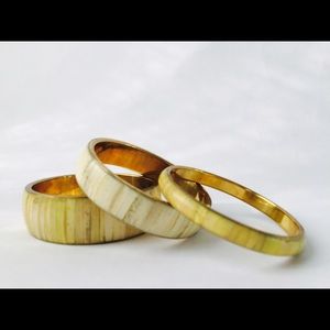 Bamboo style, stackable bracelet in beige/yellow tones. The simplicity of this bracelet can add freshness to any wardrobe. Gold accent. Diameter is 7". (Set comes with 3 bracelets) Brand new. (3 sets available for sale)