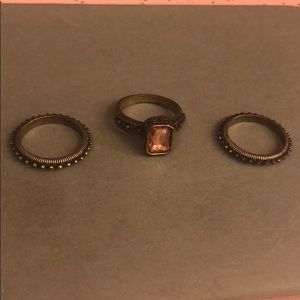 Three stackable rings. Center ring has a light pink stone. I usually wear a size 6 ring, and this one fits comfortably on my pointer and middle fingers.