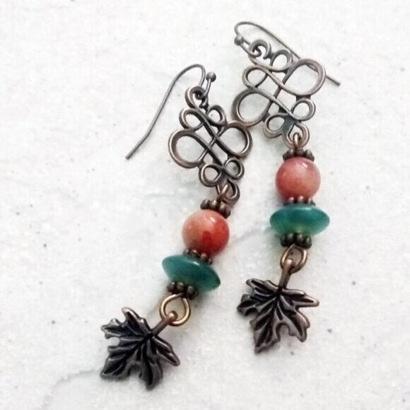 Focal points on this pair are the copper filigree connectors and the copper maple leaves! The stacked bead section includes a muted "mango to pumpkin" hued Aventurine and flat green Agate Rondelle Beads, separated by copper daisy spacers. The earwires are coated copper as well. These are longer dangle earrings @ just right at 3" or so, but not heavy or cumbersome.