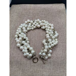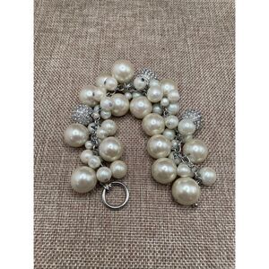 Stacked faux pearls with chains of rhinestones running thru the pearls.