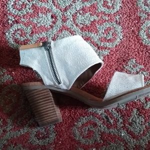 Toms off white linen like material stacked heel sandal sz 8 inside zip