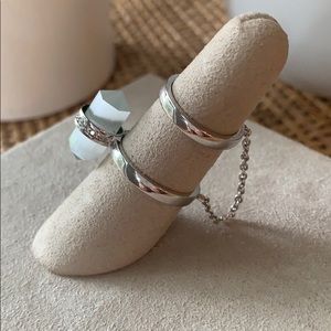 NWOT Stacked ring adorned with cat’s eye and cubic zirconia set in rhodium plated brass. Dainty chain connects the two pieces. Larger ring is size 7, smaller ring is size 4.