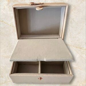 Hardware: Rose Gold. Snap Open/Close. The Mini Jewellery Box Set is perfect for a smaller jewellery collection, with space to keep a selection of necklaces, rings, earrings, watches and more, organized. Lined with gray velvet interior which keeps jewellery safely protected. With a faux-leather exterior. Some minor signs of wear, but no stains or tears. Smoke Free Home.