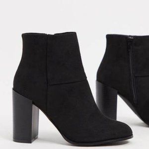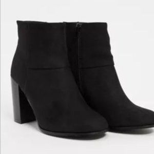 Features faux suede upper, side zip fastening, block heel, and round toe