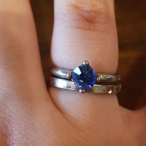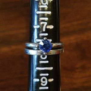 This stacking ring set includes five rings of various sizes for you to style. Possibilities are up to you! Note there is a small crack on the upper right quadrant of the blue stone ring visible from the second image.