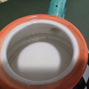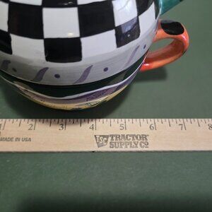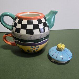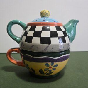 Ceramic three piece stacking 'Tea for One' Tea Set. The whimsical, hand painted design features a checkered tea pot with contrasting spout and lid, and a floral tea cup on the bottom. Recommend for decoration only. There are some hairline cracks in the actual cup and I have tried to show those in the pictures above. Would be perfect to use as storage for tea bags, sugar, etc.!! The overall height is approximately 7".