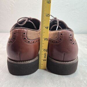 FEATURES/ACCENTS: Low flat heel. Wing tip accents. Round toe. Comfort, cushioned footbed. Brown color. Lace up closure.