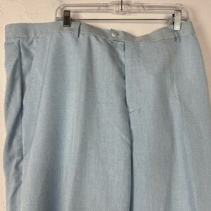 Stacy Adams mens size 48x30 dress pants trousers in a heathered marled light blue color. Button front with zipper fly and pockets. Logo tab on back. Pleated seam detail. Interior waistband button. Unlined. Perfect for career, office, and work use or casual wear. Knit 100% rayon fabric with no stretch. New with the tags. Only flaw are some untreated stains and marks on pants. There is some yellowing on waistband as well. No other flaws.