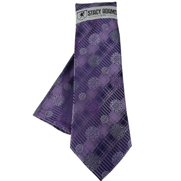 Stacy Adams Men Tie Hanky Purple Lilac Charcoal Gray Plaids & Checks 3.25" Wide