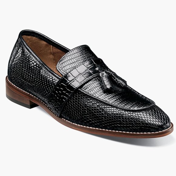 Stacy Adams men's Pacetti tasseled snakeskin / crocodile embossed black leather slip on loafers. Men's size 7.5.