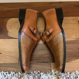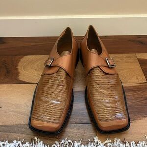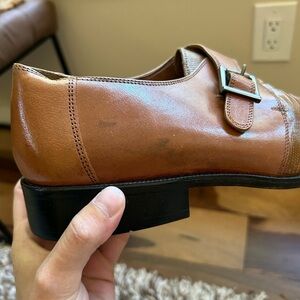 EUC pair of brown leather dress shoes from Stacy Adams in a size 40. These shoes have a crossover buckle detail and contrast panels on the top of the foot. Some minor marks as pictured. No other stains or flaws!