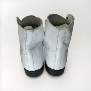 Men’s Stacy Adams white leather cap-toe dress boots in size 7.5 D. Classic lace-up design with punched detailing, leather uppers, and leather soles. These have a great vintage/formal look — ideal for dress wear, performances, uniforms, or retro fashion.
