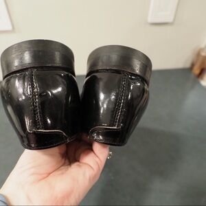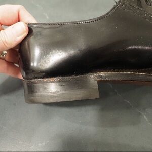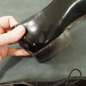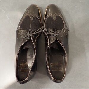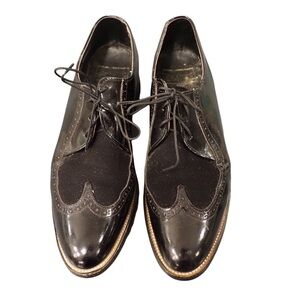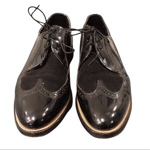 Black patent leather and suede lace-up wingtip derby’s shoes