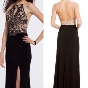 Blondie Nites by Stacy Sklar black evening gown meticulous design over blush pink color semi-sheer bodice with built in bra. Halter style, rounding neck to back adjustable straps, back zip up & hook clasp closure.