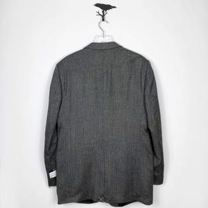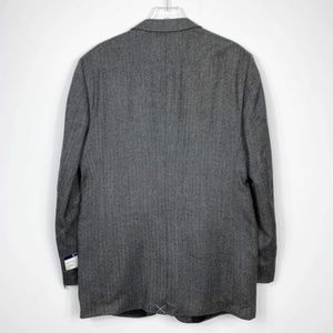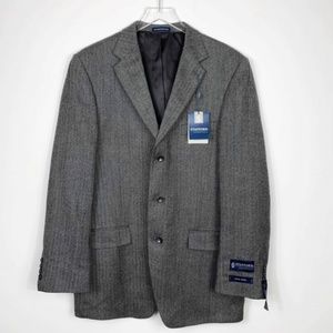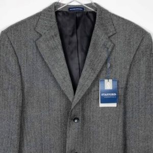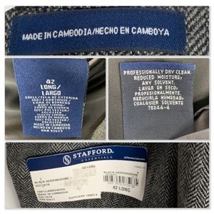 Stafford black herringbone classic fit cape wool suit jacket. 3 button close. Notched collar, lapel buttonhole. Left breast pocket, 2 flap pockets. 4 kissing button sleeve. Single back vent. 1 inner button pocket & 2 open pockets. Fully lined. 100% lambswool. NWT.