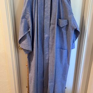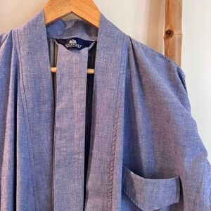 Comfortable blue cotton robe. Features classic design. Ideal for lounging.