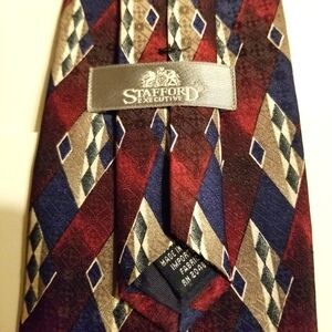 Stafford Executive Tie Imported Silk Woven In USA Geometric Diamond Lattice Design Tipped Bar & Tac Strings 54" Long 4” Wide Dark Red Blue Taupe & WHITE RN 20485 Excellent Condition