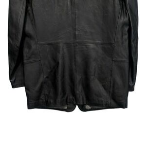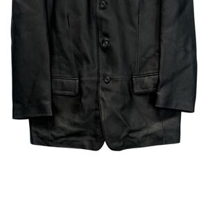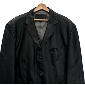 Features: 100% genuine leather outer fabric. Lined inner. Outer pockets and inner pockets. Long sleeve. Notch Lapel collared. Single breasted 3 button front closure.