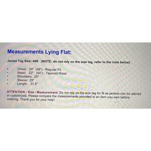 ATTENTION - Size / Measurement: Do not rely on the size tag for fit as jackets can be altered or customized.