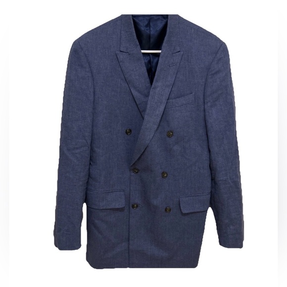 Elevate your style with this sophisticated blue double-breasted blazer. Perfect for formal occasions or a sharp office look.