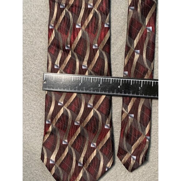 This Stafford men's silk tie exudes finesse and style. With a geometric pattern in hues of red, brown, and beige, it measures 4 inches wide and 62 inches long, perfect for any formal occasion.