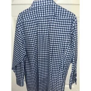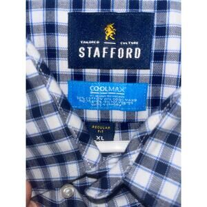 This is a Stafford men's long-sleeve, button-up dress shirt in a blue and white checkered pattern. It is a size XL with a regular fit and is made with Coolmax technology, which helps to wick moisture away from the body, keeping the wearer cool and dry. The fabric is a blend of cotton and polyester and is marketed as wrinkle-free and stretchable for comfort and easy care. The shirt features a button-down collar and a chest pocket.