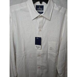 The Stafford Regular Fit Dress Shirt in Men's size medium, white, is a classic and versatile piece perfect for various occasions such as business meetings, casual outings, and travel. Made from a blended fabric of rayon, linen, and cotton, this shirt features a spread collar, button closure, and a solid pattern. With a chest size of 21 inches and a neck size of 15 inches, this dress shirt has a regular fit and a barrel cuff style, making it both stylish and comfortable for everyday wear.