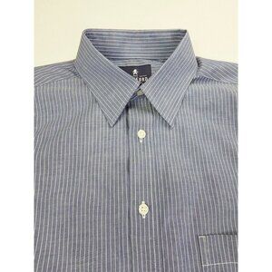 The Stafford Regular Fit Size 15 32-33 Men Gray White Stripe Long Sleeve Super Shirt is a classic and versatile dress shirt suitable for various occasions such as travel, wedding, party, formal events, and workwear. Made from a blend of polyester and cotton, this woven shirt features a collared neckline, button closure, and a point collar style. The striped pattern, gray color with dark fabric wash, and long sleeves add a sophisticated touch to this stylish shirt from the renowned brand Stafford. With its regular fit and all-season features, this shirt is a timeless addition to any man's wardrobe.