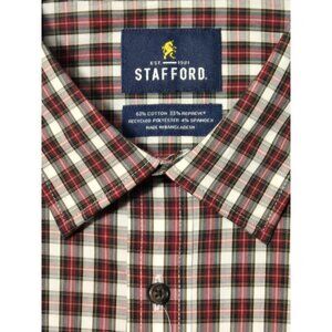 The Stafford Slim Fit Size 2XL 18-18.5 34-35 Mens Red Check Long Sleeve Travel Shirt is a stylish and versatile dress shirt perfect for various occasions such as travel, weddings, parties, or formal events. Made from a blend of polyester and cotton, this shirt features a collared neckline with a button closure and a slimming fit. The red check pattern and button accents add a touch of modern flair to the classic and colorful design. Easy to care for with machine washable fabric, this shirt is a smart choice for the modern man looking for a sophisticated yet comfortable option for work or play.