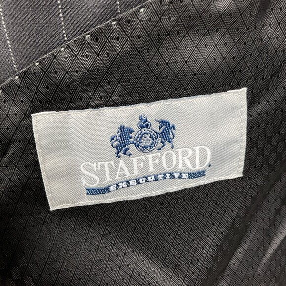 Classic and sophisticated Stafford suit for men, size 44. This 2-piece black and white striped suit is made from durable polyester and features a timeless chalkstripe pattern. Vintage Vital Barberis Canonico style in excellent condition.