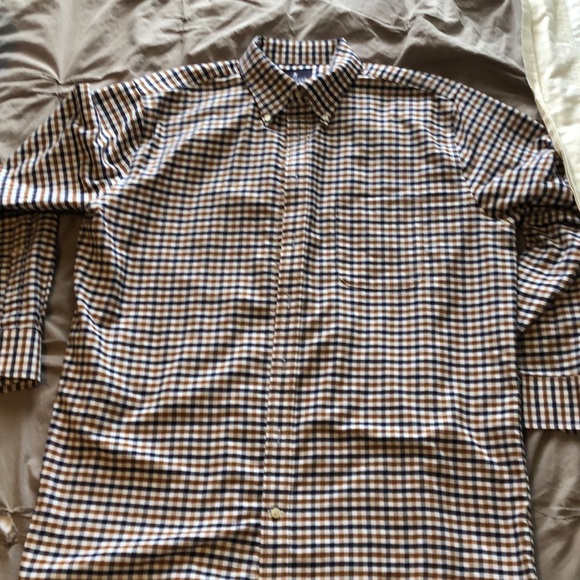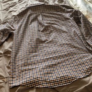 Like new. Brown blue and white plaid. Has a chest pocket. Size 16 1/2 32-33. Basically XL