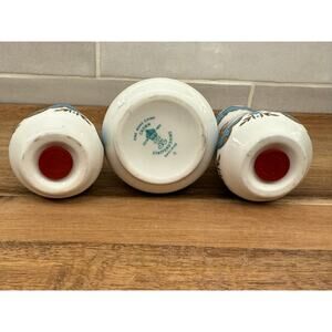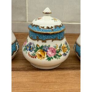Such a pretty set! There is a salt and pepper shaker with a small condiment jar & lid (no spoon). Marked on the bottom Staffordshire England fine bone China. This little set is beautiful and in great vintage condition. No cracks or chips. Great find!
