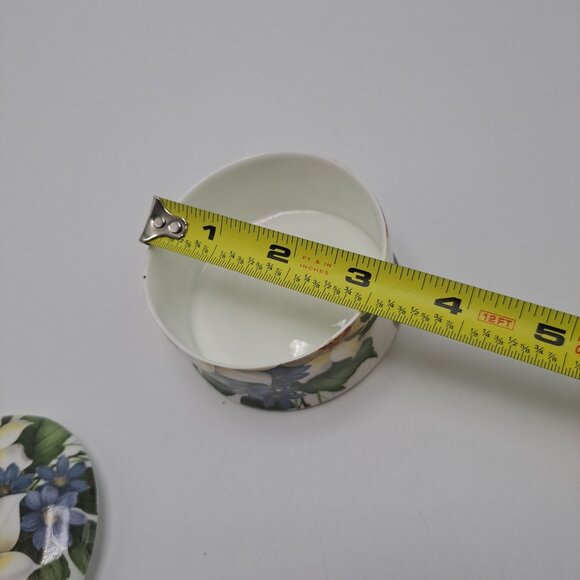 Elegant floral design on fine bone china. Ideal for storing small jewelry or keepsakes. Made in England.