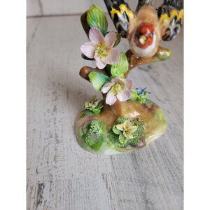 Product has flower broken off of bottom base, moderate chipping around figure, multiple reglued pieces on bird, sold as is, chip on beak, scratches and marks but otherwise in good condition