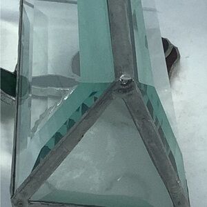 Stained glass 5” triangular vase featuring a single rose bud. No markings. Pre-owned, good condition.