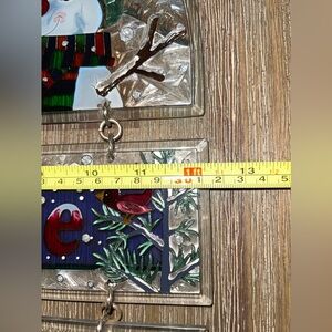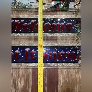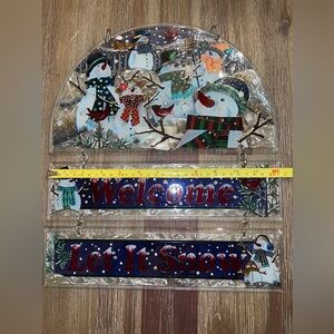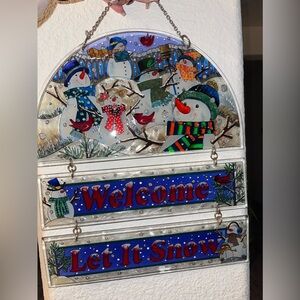 Stained Glass' Christmas AMIA 'Snowmen' Welcome, Let it Snow hanging sign. Hand painted . Pre-owned so has some wear and blemishes, scuffs as shown in the photos but still in amazing condition and so perfect for your Christmas decor. Cute group of happy snowpeople. A lot of glitter that really sparkles and shines in the snowflakes, scarfs, etc. Measurements in the photos. Please note , This is pretty heavy .